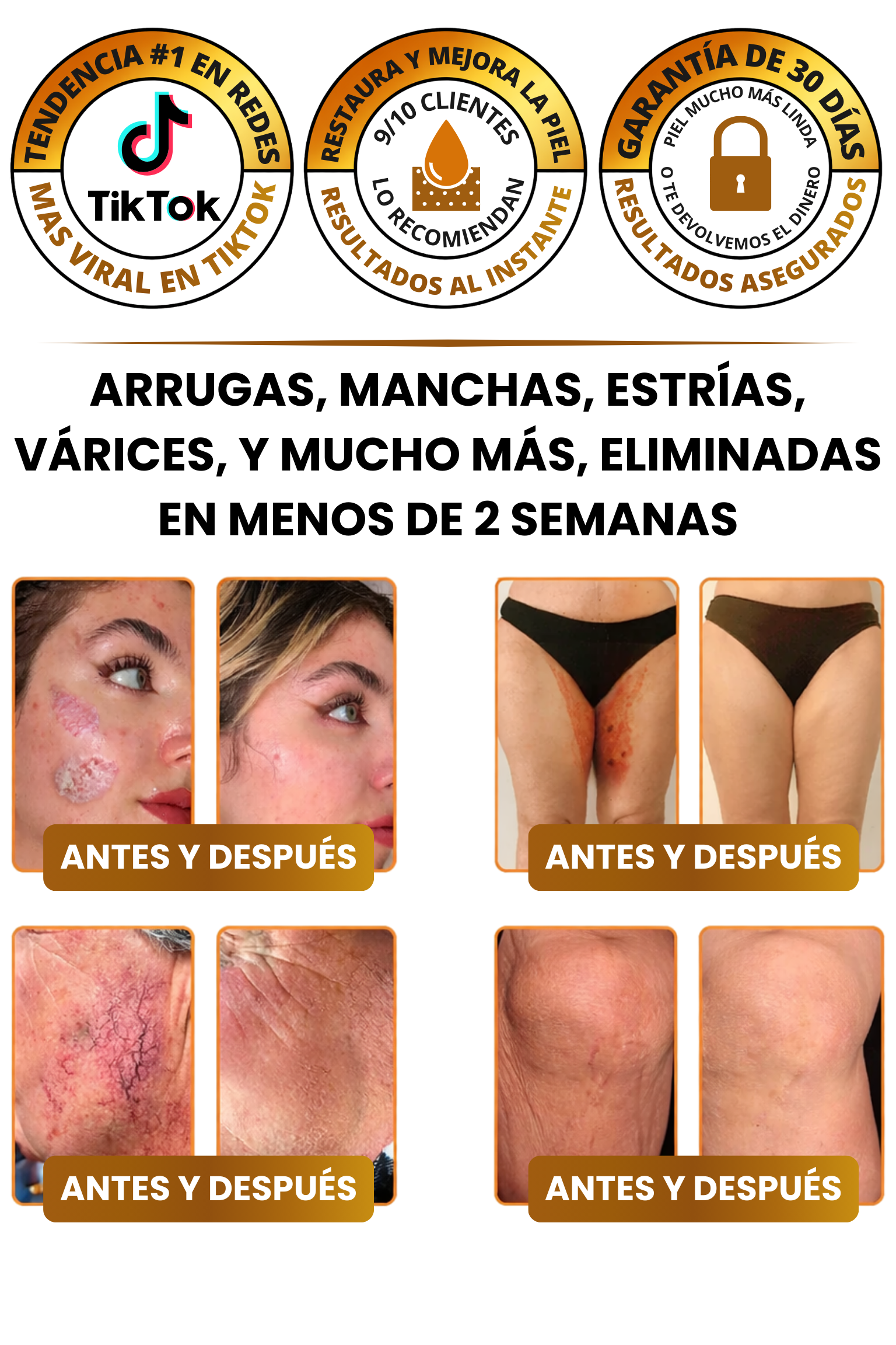 Muchos clientes notan cambios visibles en los primeros días: la piel se ve más calmada, hidratada y pareja. En casos más marcados (manchas, marcas, arrugas o textura dañada), los resultados se vuelven claramente visibles en 2 a 3 semanas de uso constante, como muestran las fotos reales de antes y después.
